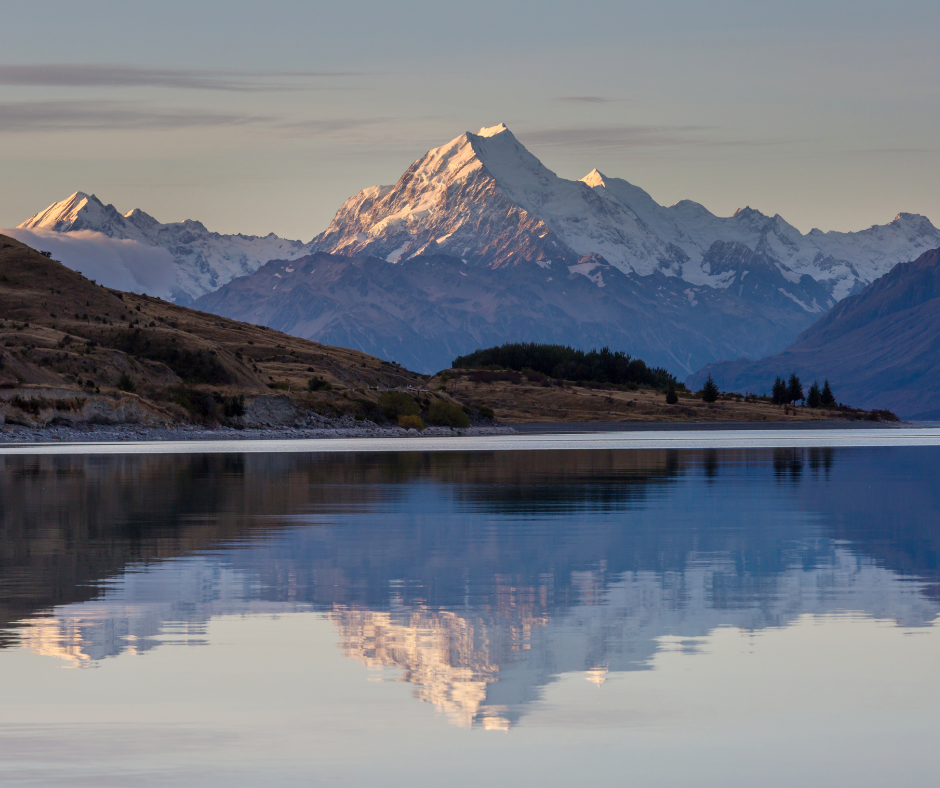 Journey through the Canterbury Plains past Lake Tekapo and the stone Church of the Good Shepherd, then continue along turquoise Lake Pukaki toward New Zealand’s highest peak, Aoraki / Mount Cook.