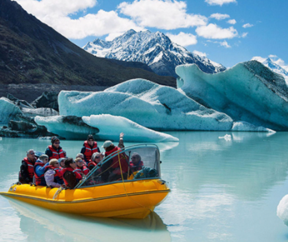 Cruise across a glacial lake on the Tasman Glacier Boat Tour, floating among icebergs as guides share the story of the Southern Alps.