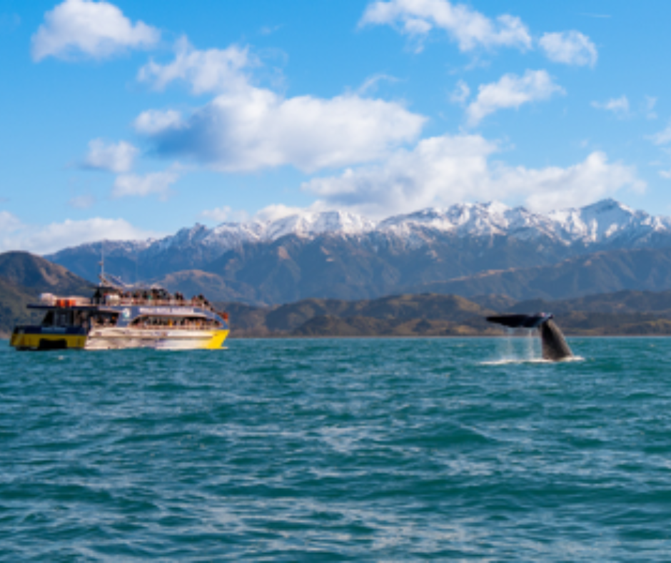 Head north along the rugged Pacific Coast Highway to Kaikōura, where snow-capped peaks meet the sea. Embark on a Whale Watch Cruise to spot giant sperm whales, playful dolphins, and soaring albatross — a true marine-life spectacle.
