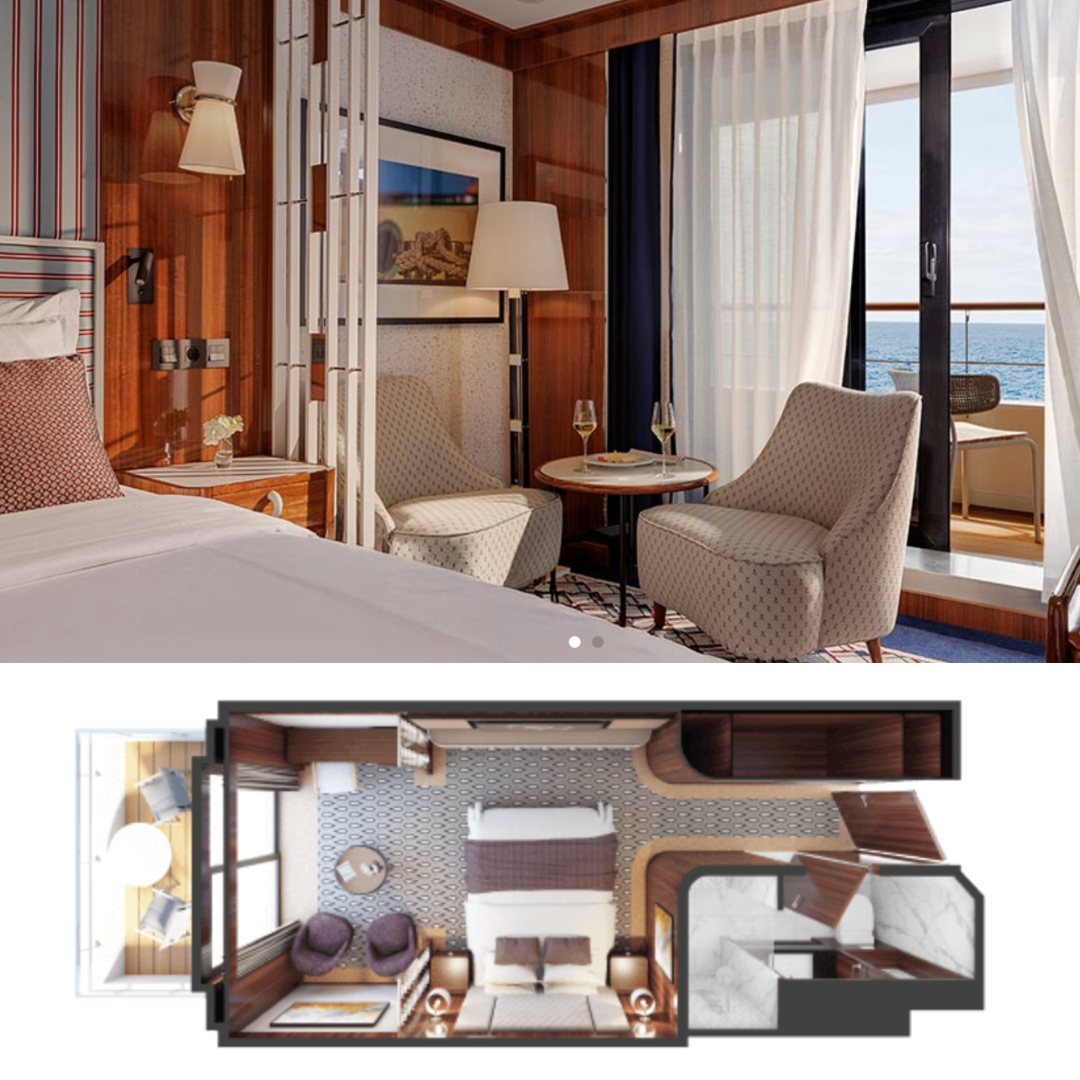 Breathe easy in our most spacious suite. Generous, double floor-to-ceiling glass sliders with ocean views create the perfect balance of indulgent nights aboard after thrilling days ashore. You have the option to have a queen bed or two twin beds and twin sleeper sofa. The cabin is 465 sqft. Oversized private balcony. This cabin includes Butler Service and Expanded Room Service..